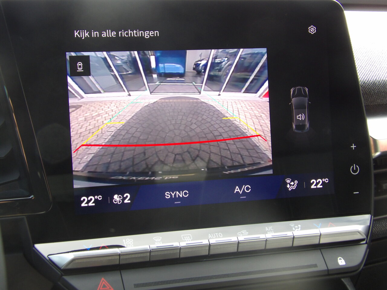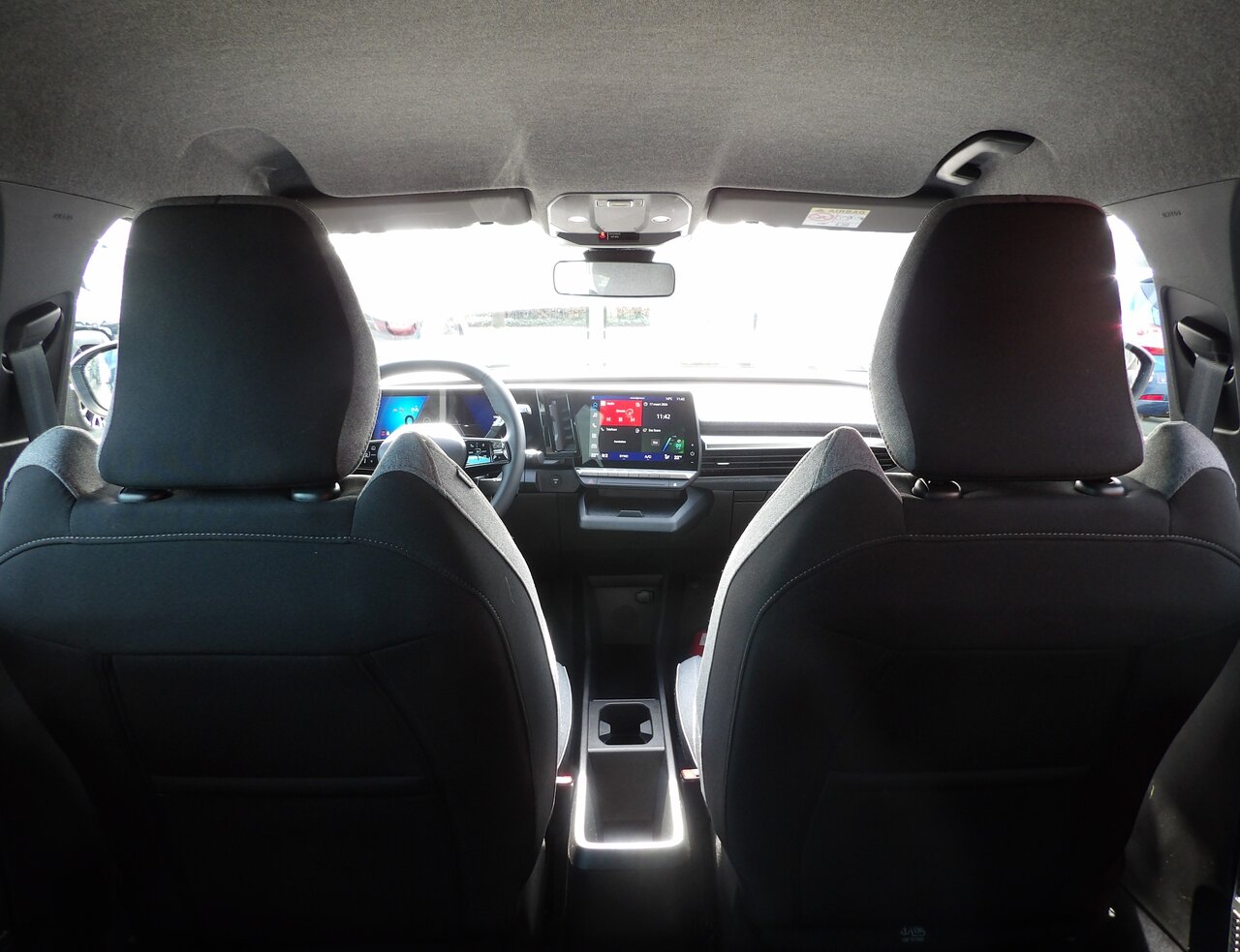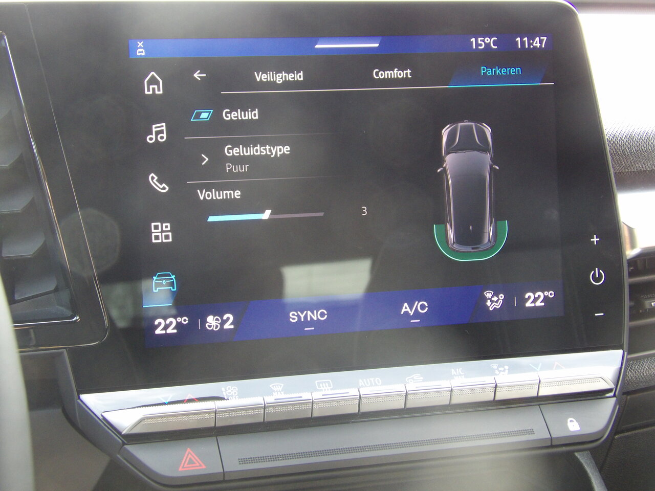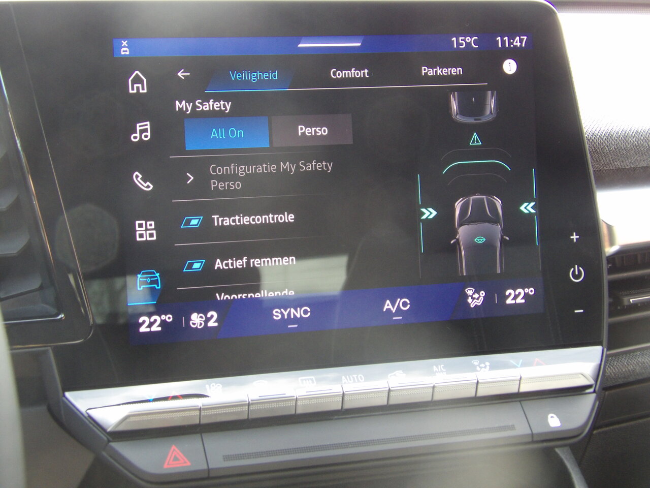 De wagen is uitgerust met adaptieve snelheidsregelaar, snelheidsbegrenzer, actieve noodremhulpsystemen, parkeersensoren, parkeercamera achteraan, gordijnairbags voor mid en zij, ABS, Hill Start Assist, bandenspanningsdetectie en EV-geluid voor voetgangers. Vermoeidheidswaarschuwing, SOS call en een handenvrije startkaart dragen bij aan extra veiligheid en gebruiksgemak.